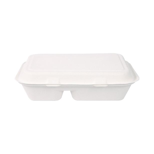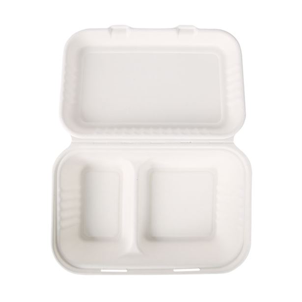 aus Zuckerrohrfasern, mit einer kleineren und einer größeren Unterteilung, wasser-, öl- und fettbeständig, stapelbar, sehr platzsparend, für Kühlschrank und Mikrowelle geeignet, hitzebeständig bis 100°C, Format (LxBxH) ca. 24,5 x 16 x 6,8 cm